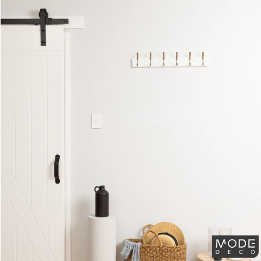 6 Brushed Nickel Hooks on White Board Hat & Coat Rack